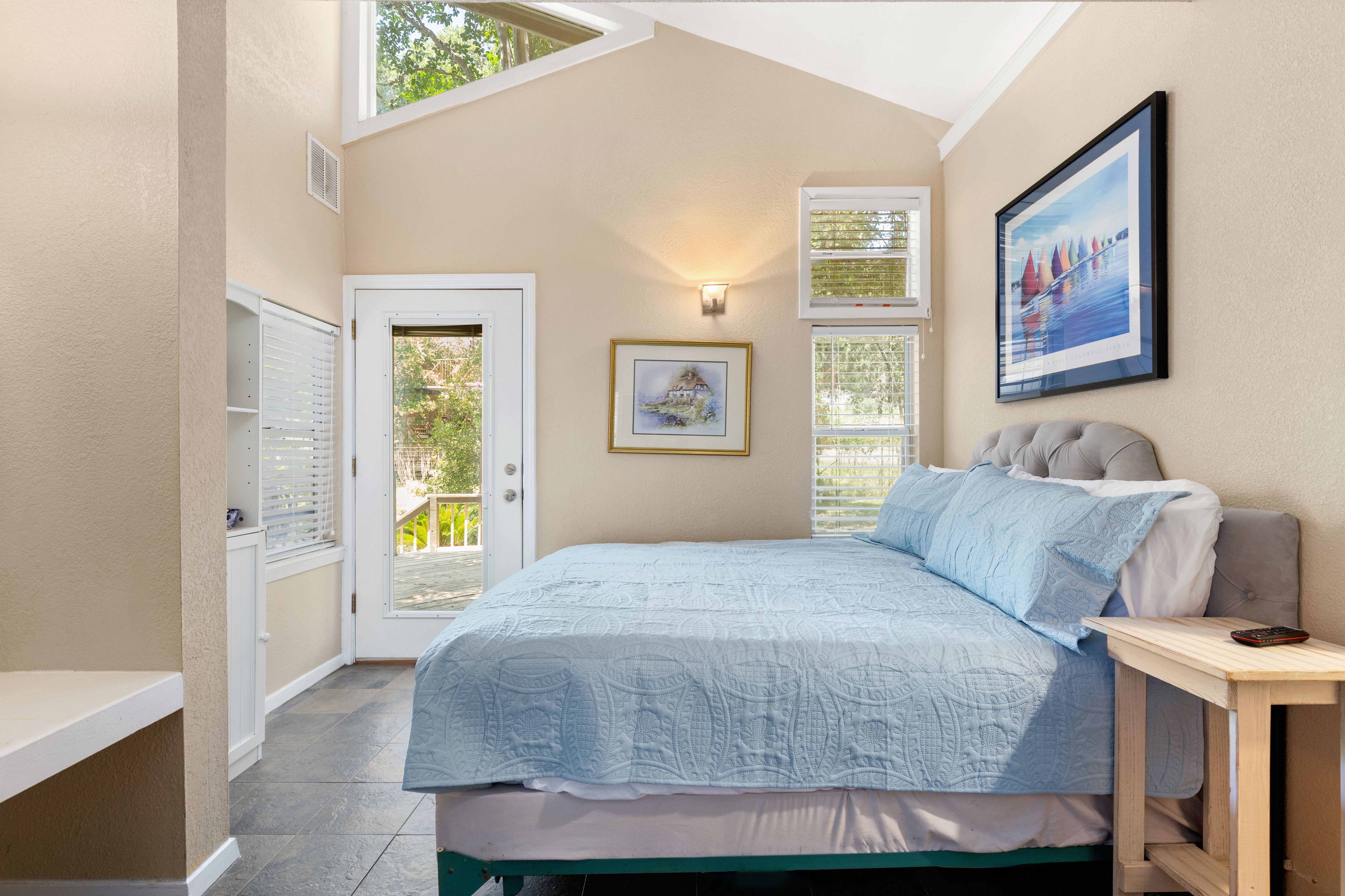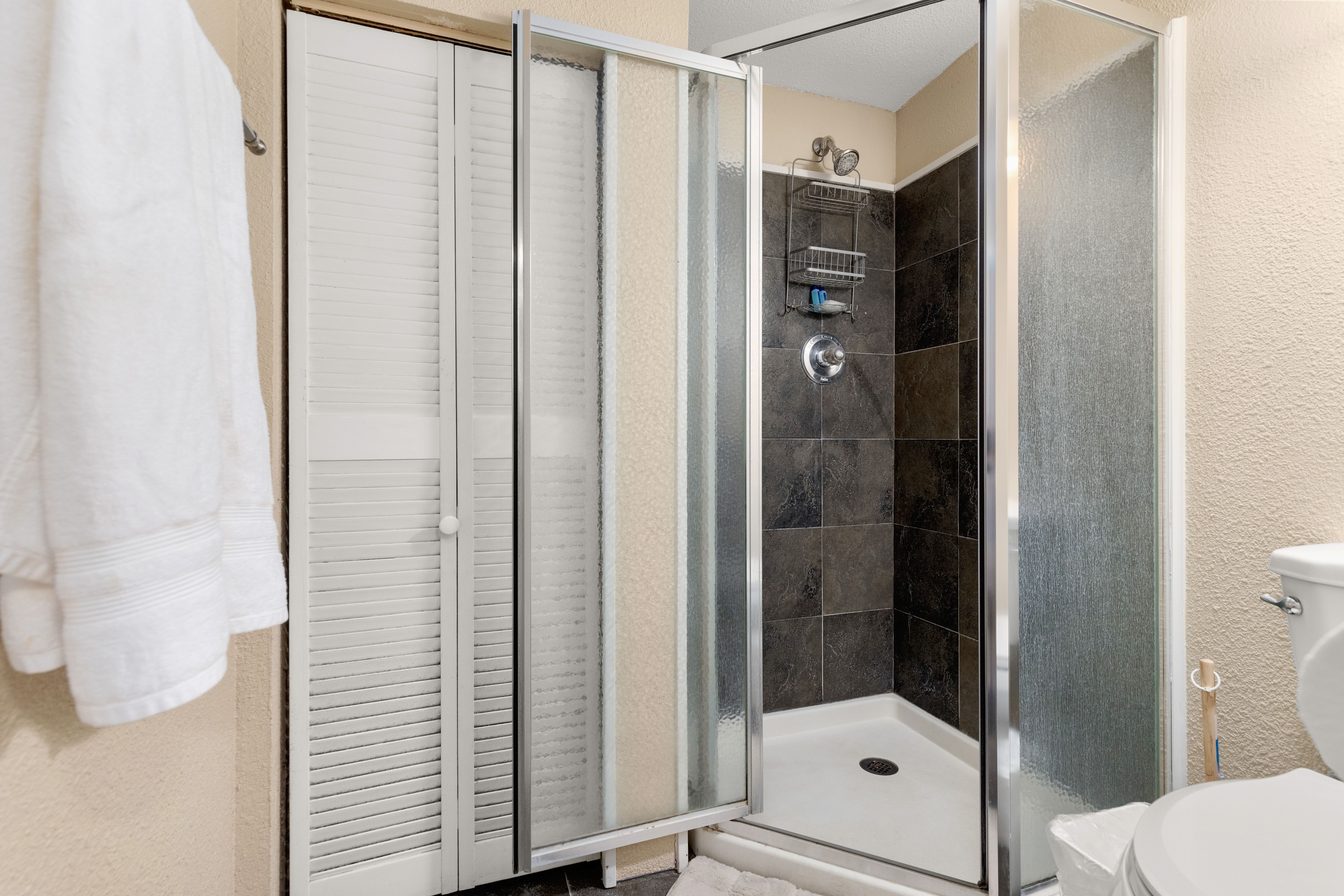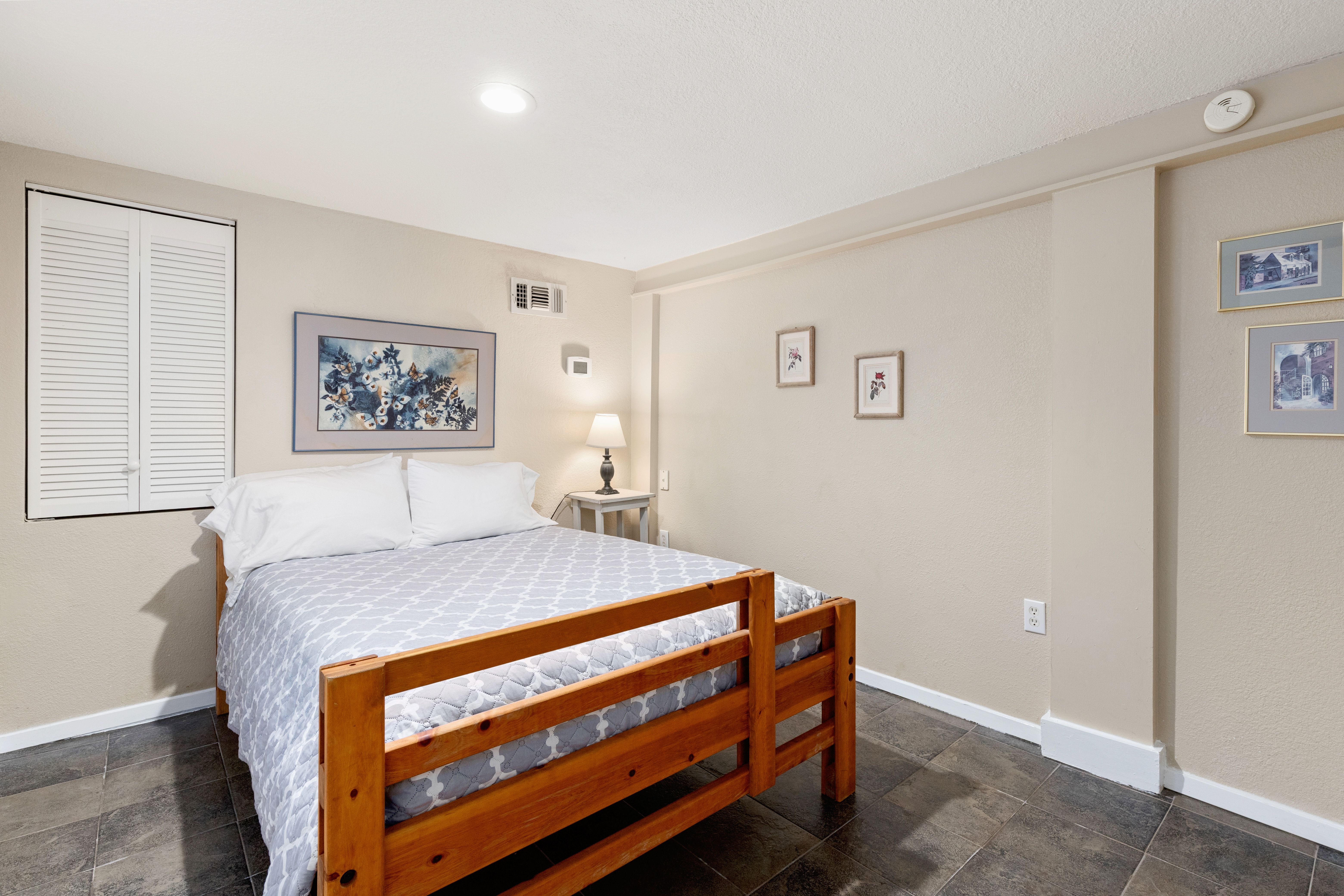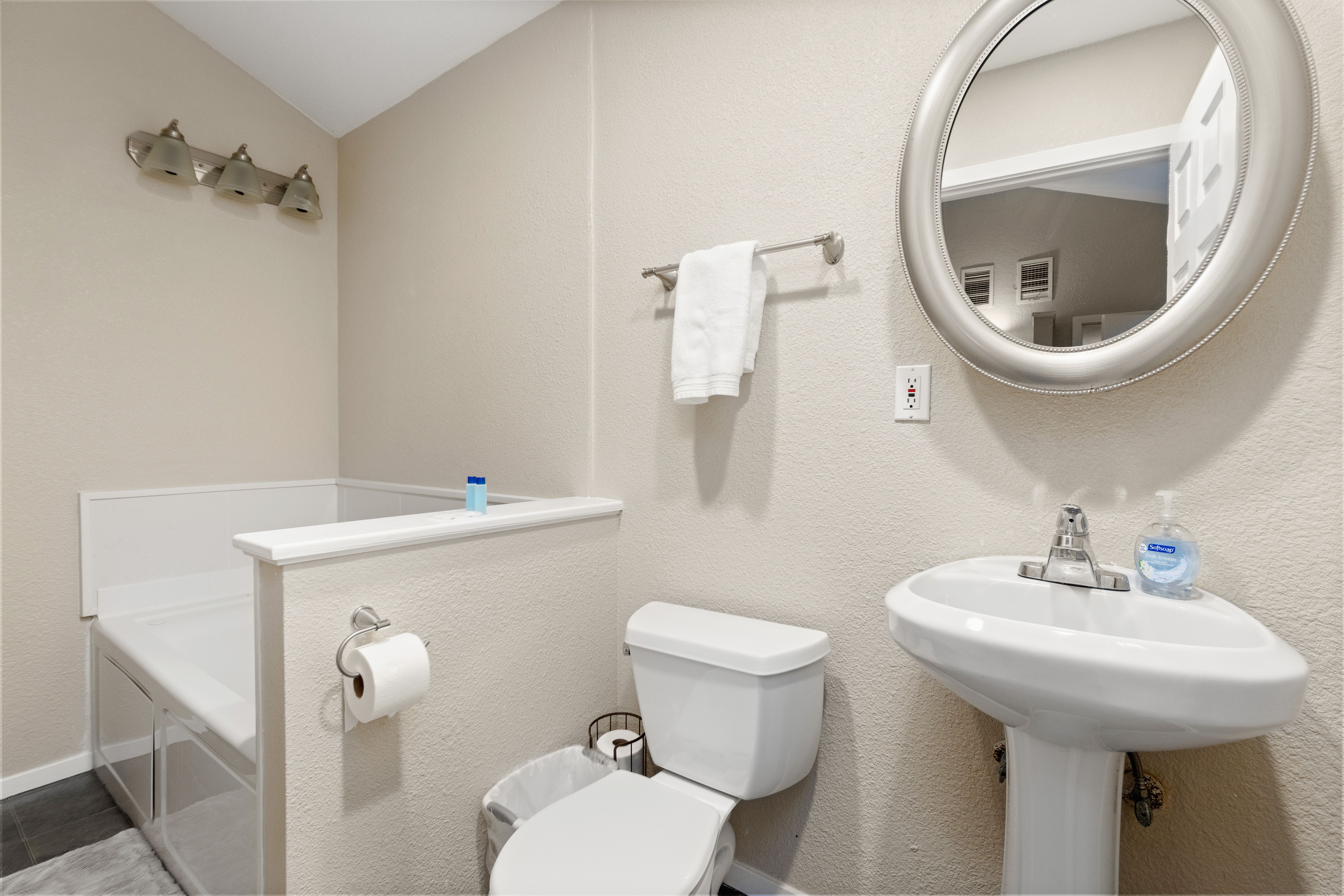 The home is multi-level, with one set of stairs that are steep, and another set that is more manageable. As you enter through the main door, you'll find yourself in the main living area, which includes a living room, kitchen, large deck with a grill, and a bedroom with a queen-sized bed, as well as one bathroom. Down one set of stairs, you'll find two additional bedrooms and the laundry area, with one bedroom featuring a king-sized bed that opens out to the lower deck with the hot tub. The other downstairs bedroom has a full-sized bed. Continue up a half set of stairs to find the bathroom for these two bedrooms, which includes a stand-up shower. The master bedroom is located upstairs and boasts a king-sized bed, with a master bathroom that features a jetted bathtub. The master bedroom also has a patio door that leads out to the main level, providing easy access to the living area and kitchen.